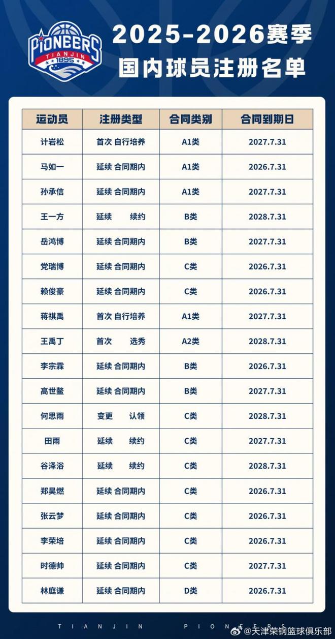 原文写道:“【官宣】经CBA公司审核并完成注册公示,天津荣钢篮球俱乐部已完成2025-2026赛季CBA联赛国内球员注册工作。新赛季先行者将继续秉承“自强不息、奋斗不止、永不言败”的荣程精神,全力以赴迎接每一场比赛,向新的目标发起冲击!”