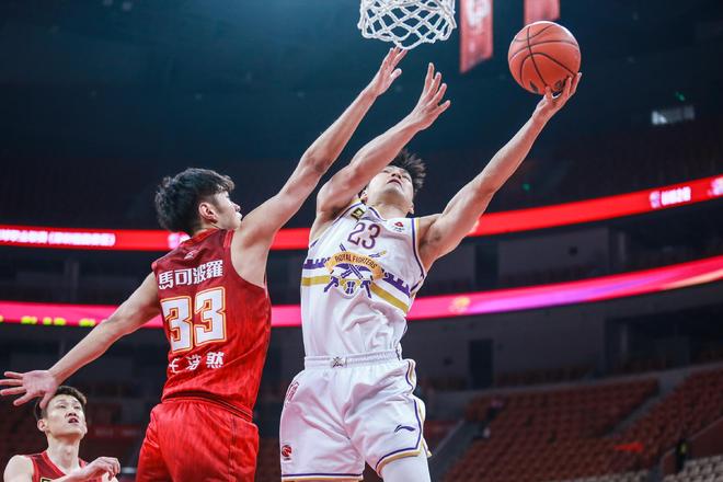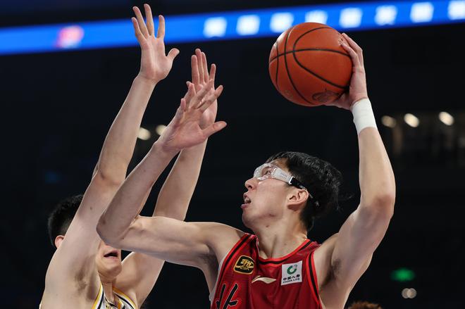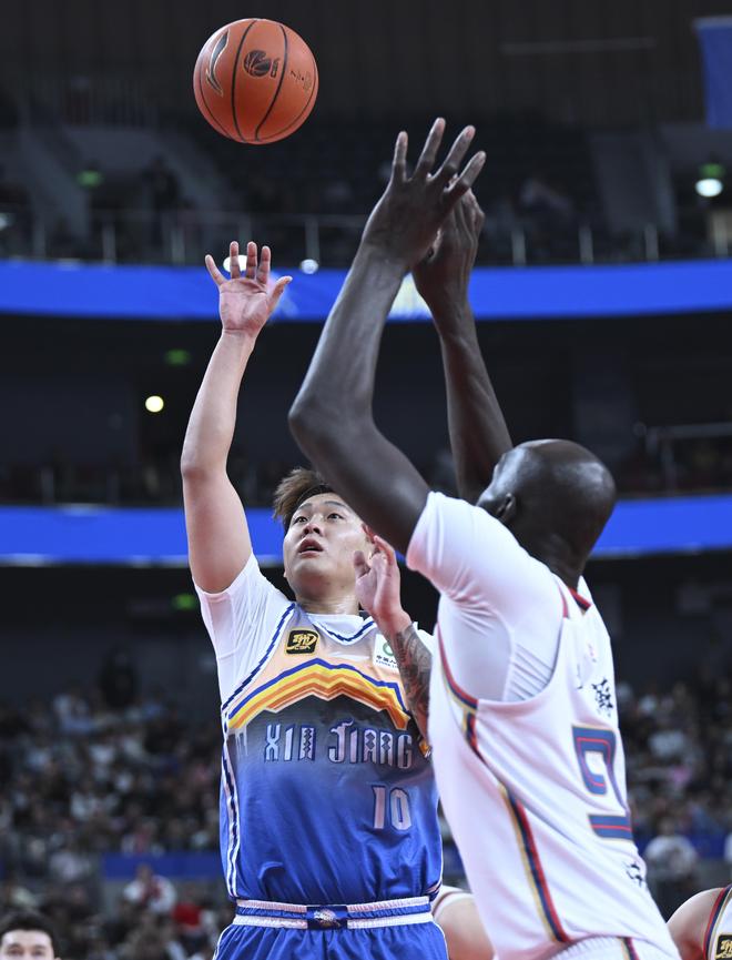 4月4日,赵睿(左)在2024-2025赛季CBA季后赛首轮比赛中投篮。新华社记者 胡虎虎 摄
