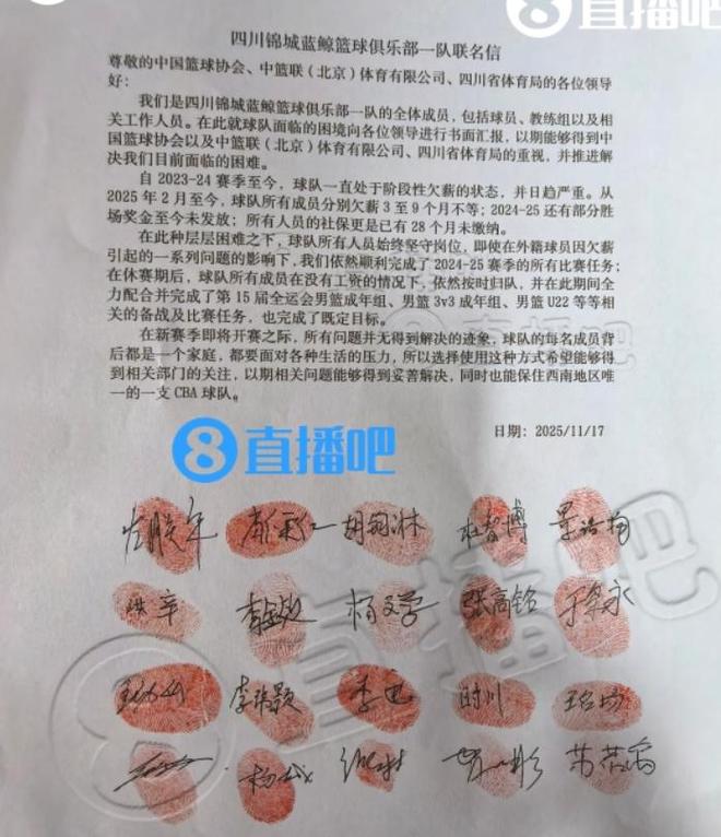 联名信中,四川男篮全体成员表示他们遭遇欠薪3至9个月不等,且有部分奖金未发放,社保更是有28个月未交!联名信的最后有四川所有队员的签名和红手印。截止到目前为止,四川俱乐部,四川体育局和篮协以及CBA公司,尚未对此事进行回应。