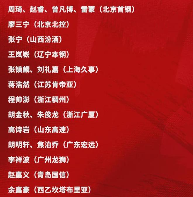 后卫赵睿、廖三宁、王岚嵚、程帅澎、高诗岩、胡明轩;前锋曾凡博、雷蒙、张宁、张镇麟、刘礼嘉、朱俊龙、赵嘉义;内线周琦、蒋浩然、胡金秋、焦泊乔、李祥波、余嘉豪。