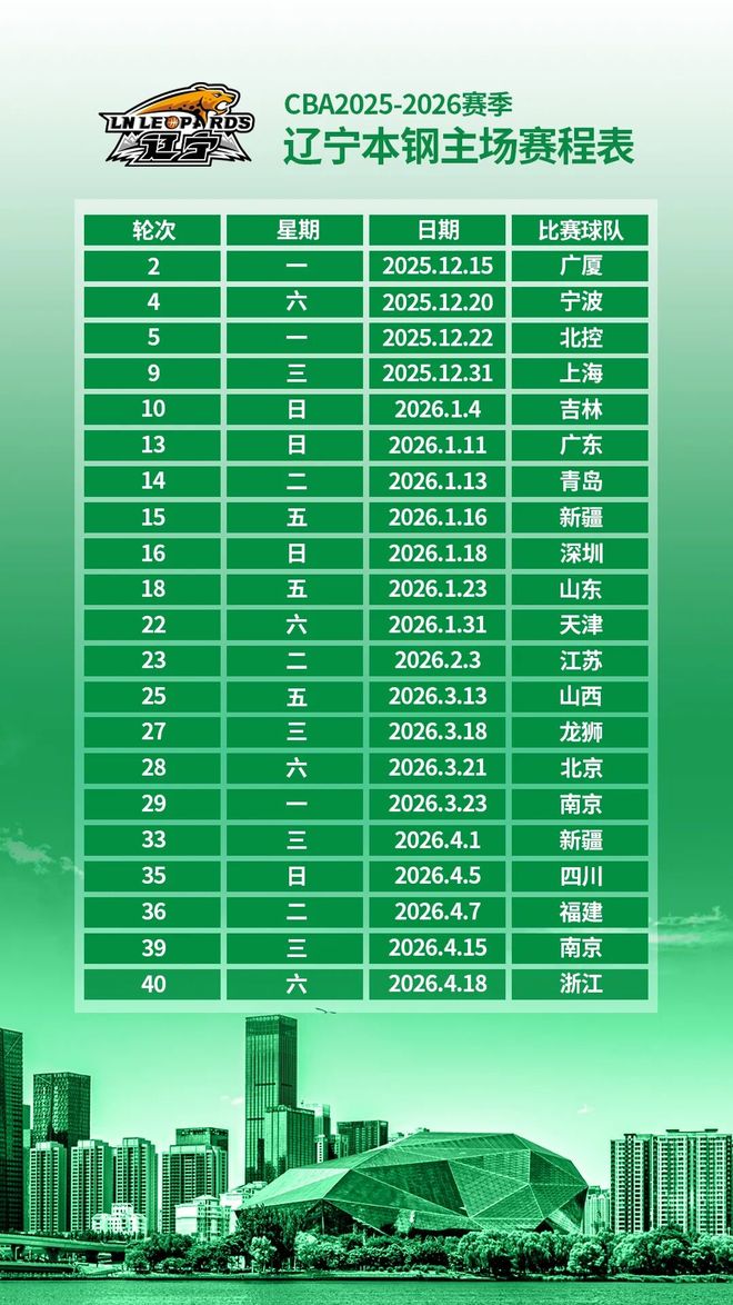 2025-2026赛季CBA常规赛即将于12月12日拉开帷幕,辽宁本钢队的首个主场比赛是12月15日迎战卫冕冠军浙江广厦队,辽宁本钢队主场售票方案已经确定: 常规赛主场套票将于29日上午9点58分开售。购买本赛季辽宁本钢队主场套票可免费领取不同档次的辽篮周边产品礼包,并有机会优先参与球队训练日活动与球员近距离互动(活动详情及参与方式请留意官方发布)。具体的票价、座位分布、售票方式及主场赛程表详见后附图表。