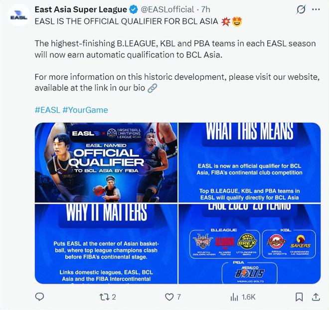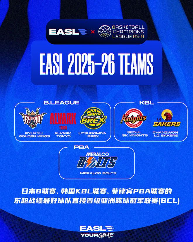 北京时间12月15日,EASL(东亚超级联赛,简称:东超)官方宣布:EASL成为BCL(亚洲篮球冠军联赛)亚洲区的官方资格赛,日本B联赛、韩国KBL联赛、菲律宾PBA联赛中在东超排名最高的球队自动获得BCL亚冠的参赛资格。