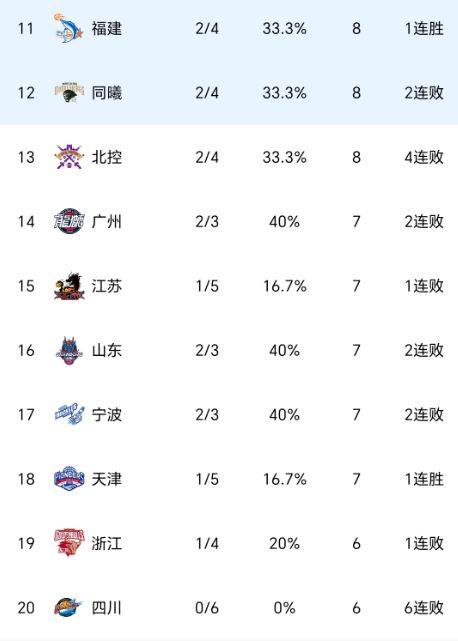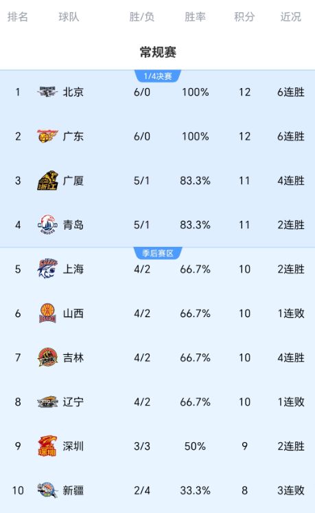 北京队开局五轮全胜,强势领跑积分榜,因广厦队多赛一轮,所以暂时升至第一,只要北京队继续连胜,就能夺回榜首位置。