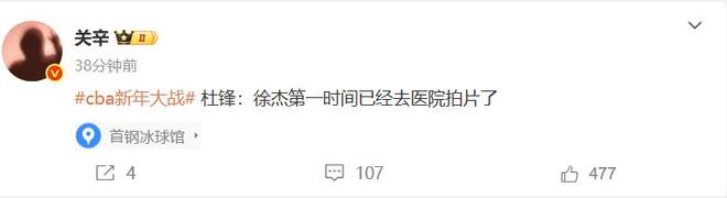 接下来广东队还有多场硬仗要打,下一轮将继续客场挑战北控,紧接着还要迎来浙江、深圳的2场硬仗,徐杰的伤情关系到球队接下来能否继续争胜,在徐杰受伤下场阶段,现场记者关辛表示:徐杰已经第一时间去医院拍片了。