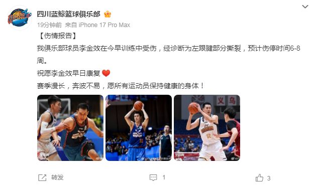 如今四川男篮官方公告写道:“我俱乐部球员李金效在今早训练中受伤,经诊断为左跟腱部分撕裂,预计伤停时间6-8周。祝愿李金效早日康复,赛季漫长,奔波不易,愿所有运动员保持健康的身体!”