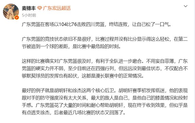 不妨先来看看媒体人麦穗丰的个人见解,麦老师依旧认为广东队的竞技状态不是很好,比赛过程并没有比分显示得这么轻松,广东男篮的硬实力并不弱,至少目前还在四强行列,但远远没到最佳状态,不仅配合不够默契球员的发挥也有起伏,这都是漫长联赛中的正常情况。