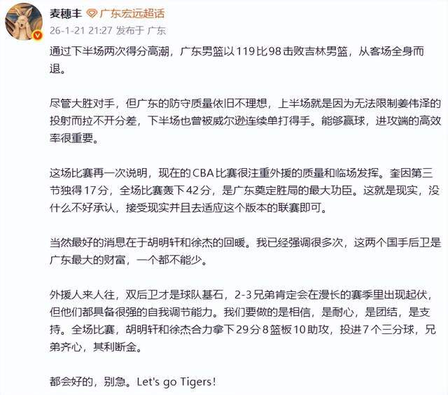119-98!广东男篮客场大胜吉林队21分,斩获2连胜的同时,也稳住了积分榜第2的位置。按说赢了21分,外界该是一片赞誉才对,没想到,广东媒体人麦穗丰老师却怒了,怒批广东队,强点这一点很是不理想,并盛赞一人。