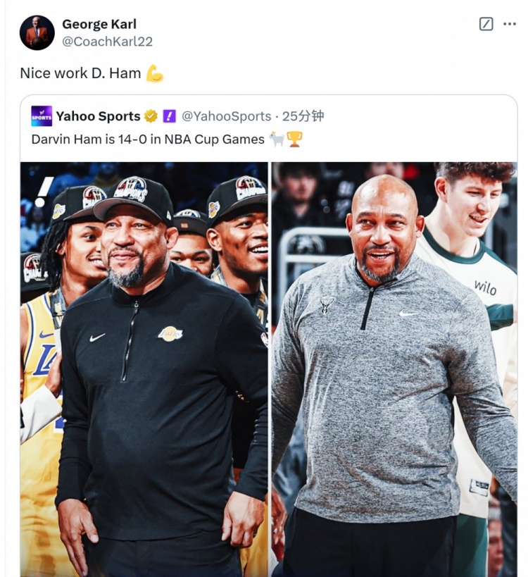 赛后前掘金主帅乔治-卡尔转发了相关动态,写道:“干得漂亮,哈姆”