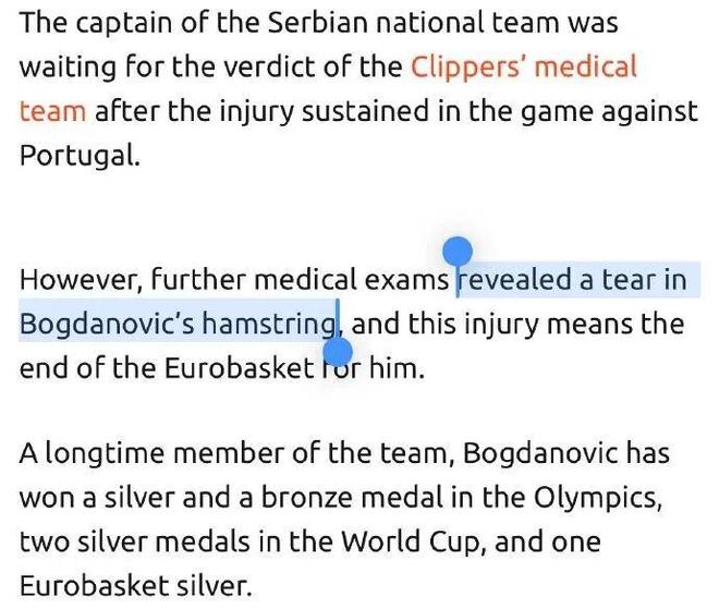 博格丹诺维奇遭遇腿筋撕裂,今年欧锦赛报销,将前往洛杉矶由快船负责后续治疗......