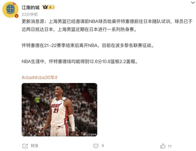 从媒体透露的消息可以知道,最近上海男篮正在日本这边安排了非常多的热身赛。在备战新赛季比赛的同时,他们也正在做好完善阵型的准备。据了解目前上海队已经邀请前NBA球员哈桑怀特塞德前往日本,跟随球队一起试训。估计是希望通过接下来的热身赛和球队进行磨合,如果能力突出,新赛季将有可能出战比赛。