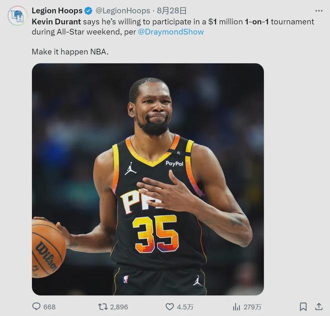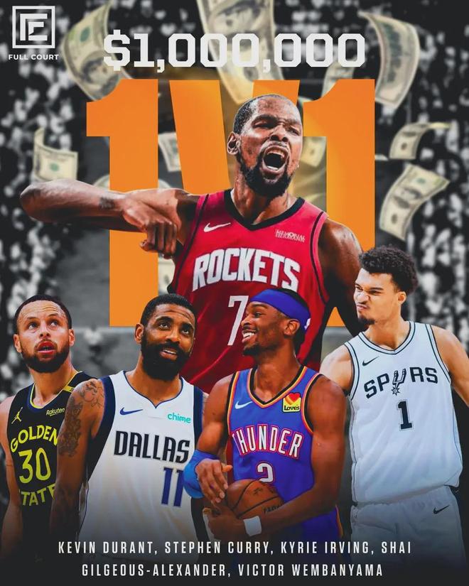 无独有偶,今年8月28日,杜兰特在节目中透露,自己愿意参加2026全明星百万美元奖金的1v1单挑赛。到了9月4日,NBA名记Shams报道,全明星正赛由两支美国队和一支世界队参加,每支球队8名球员。但他并未提及1v1单挑赛。