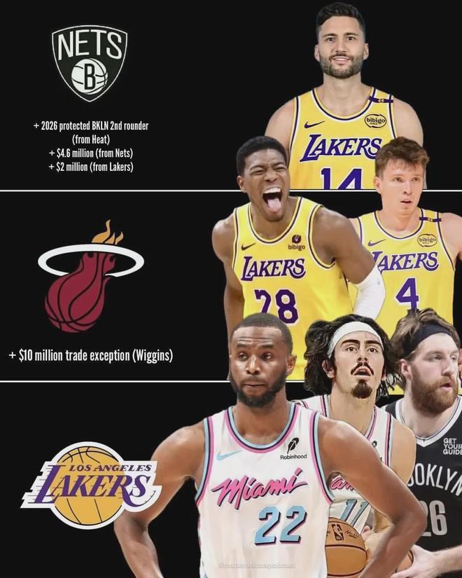 湖人得到维金斯、哈克斯和德鲁·蒂米,热火得到八村塁、克内克特和1000万美元交易特例,篮网得到克莱伯、2026年热火的受保护次轮签、460万美元和200万美元。