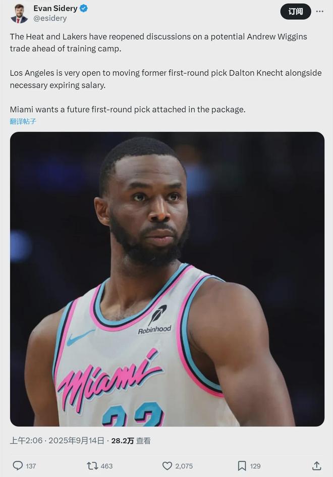 今天早上的最新消息,据美国篮球记者Evan Sidery报道,热火已经跟湖人在季前训练营开启之际重新展开了关于维金斯的潜在交易讨论。