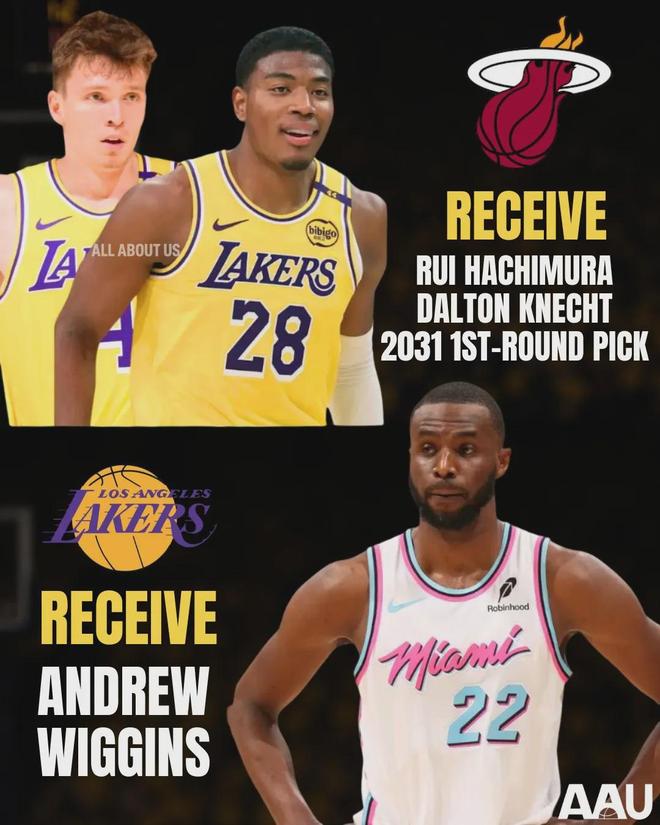 当时的交易方案是湖人得到维金斯,热火得到八村塁、克内克特和2031年的首轮签。