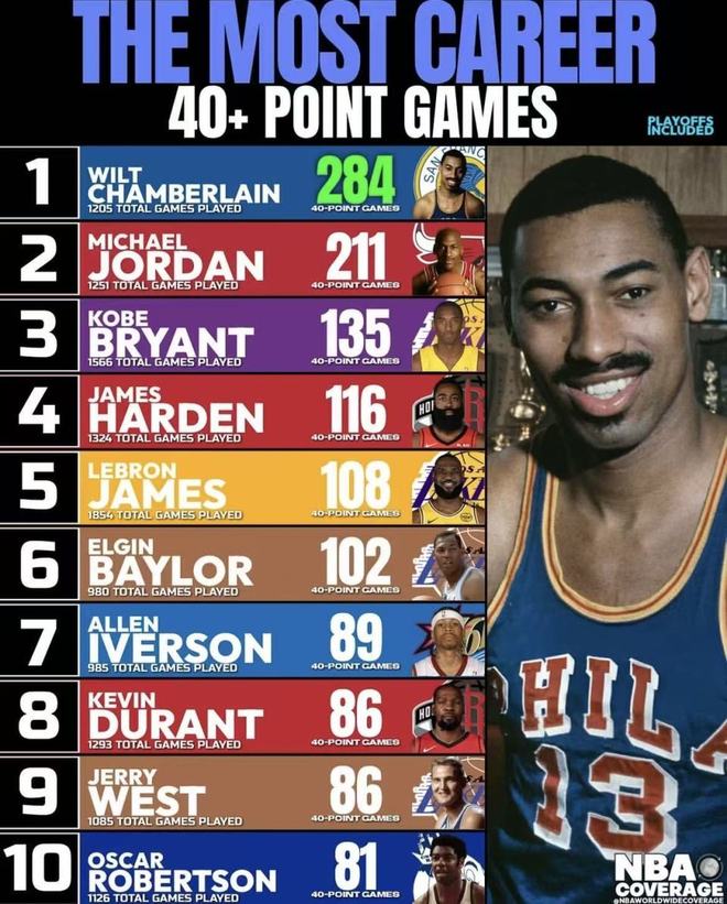 这份榜单揭示了不同时代球星在得分方式和角色定位上的差异。张伯伦以284场、23.6%的恐怖比率遥遥领先,既得益于60年代的高回合数和他个人的绝对统治力,也反映出当时球队围绕中锋无限灌球的打法。乔丹则以211场、16.9%排在第二,他的价值不仅在于次数,更在于含金量——多数发生在竞争最激烈的90年代季后赛中。科比和哈登则是典型的“高持球+单打”产物,前者在湖人多次扛起进攻大旗,后者在火箭无限单打体系下积累了大量40+,但从比率上看,都难与乔丹、张伯伦相提并论。