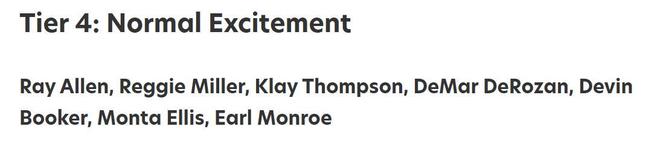 第四档的球员不仅在各自领域有着明确的杀手锏,整体实力也达到全明星级别,甚至有部分球员是超级巨星,其中克莱、雷吉米勒与雷阿伦虽然比赛风格略有不同,但都是NBA历史级别的神射手。