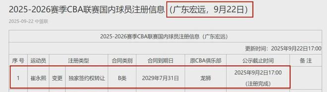 昨天,CBA公司更新了国内球员注册信息,广东宏远男篮的名单上,崔永熙的合同情况确定为B类合同,从2025年开始,到2029年结束,也就是说这是一份4年的合同。