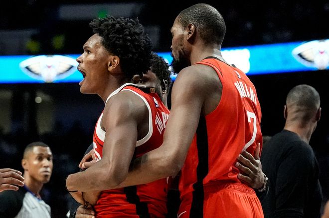 打到5分38秒场上爆发冲突,阿门-汤普森和抱摔,双方扭打导致现场乱作一团,申京第一时间劝架抱住老六,杜兰特等人则是拉住阿门,裁判多角度回放,最终吹罚阿尔瓦拉多抢篮板犯规在先,追加技术犯规,阿门因打到对手的头部吃到一级恶意犯规。