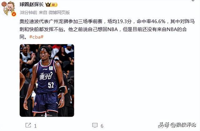 32岁的奥拉迪波代表广州龙狮的季前赛表现是证明了自己仍有很强的即战力,但从年龄段,身体状态,以及多方面的因素,实际上想要获得NBA合同的难度比较大,尤其是新赛季开打的倒计时,大部分的NBA球队已经基本确定了常规赛阵容,更多的是考虑磨合为主。