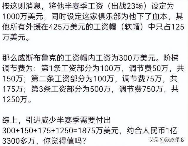 这个消息在国内引发不少争议,CBA工资帽最高只有425万,若是半个赛季就需要支付千万级别美金的合同,威少需要支付人民币过亿的投入,有媒体点评是威少团队放出消息,逼宫尽快确定合同的操作。