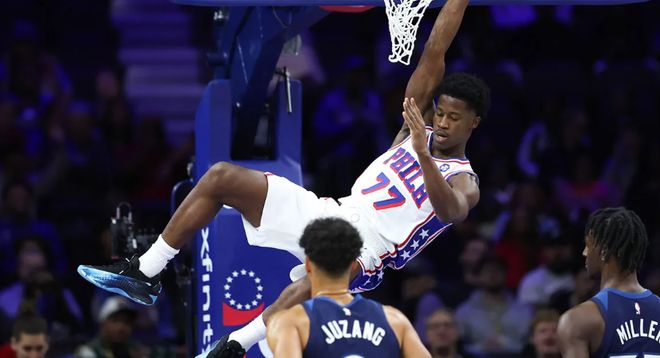 但短板也同样明显:阵地战处理能力不足,高对抗下的终结效率偏低,此外,失误率是控卫位置平均值的1.8倍,不过,这些短板并非“致命伤”,而是新秀的“常规问题”。埃奇库姆的成熟度远超同龄新秀,揭幕战中他多次在关键时刻选择“合理传球”而非“强行出手”,这种“大局观”很难得。根据球探报告显示,埃奇库姆上限是韦德,下限是奥拉迪波!从历史维度看,埃奇库姆的首秀已经跻身NBA顶级行列:NBA历史上仅有两名球员新秀揭幕战得分高于他(1954年弗兰格塞维尔35分,1959年张伯伦43分),而詹姆斯(25分)、艾弗森(30分)等传奇的首秀得分都低于他。若能保持这样的成长速度,他至少能成为全明星级别的球员,甚至有机会成为76人“后恩比德时代”的核心。