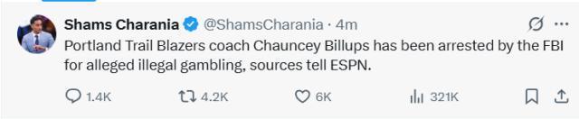 就在人们纷纷展望杨瀚森和开拓者的新赛季之旅时,波特兰方面却传来一则令人震惊的消息。根据查拉涅的报道,开拓者主教练比卢普斯因为涉嫌参与非法赌博,被FBI逮捕。据NBC率先报道,多位美国篮球圈内的名记也相继证实。