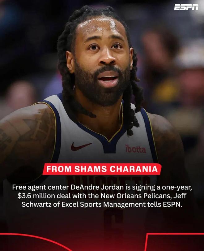 据爆料王Shams报道,小乔丹以一年360万美元加盟鹈鹕,正式开启个人职业生涯第18个赛季,这哥们上赛季在掘金打球,常规赛场均3.7分5.1板,季后赛则是场均0.9分1.3板。