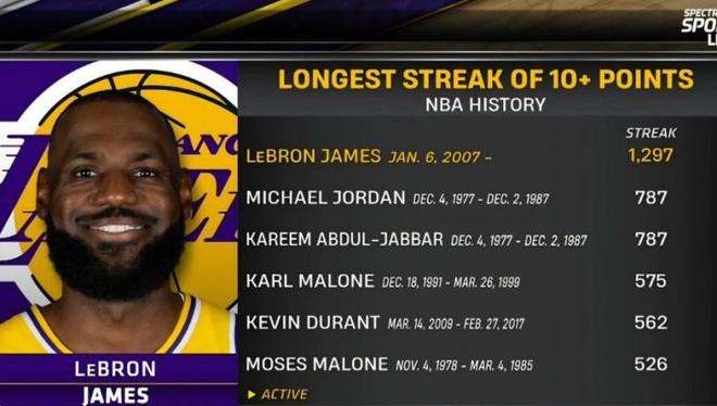 詹姆斯连续1297场比赛得分上双,这是一个什么概念?从2007年1月之后,只要詹姆斯出席的比赛,他就再也没有得到过10分以下。而老詹上一次常规赛得分没上双的时候,文班亚马才3岁,弗拉格才刚出生不满两个礼拜。