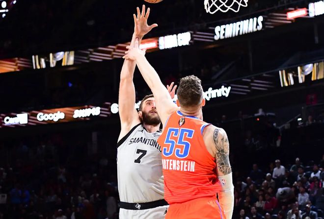 本场比赛中,马刺虽然拿下了比赛的胜利,但是球队的先发中锋卢克-科内特(Luke Kornet)的表现其实是非常糟糕的。科内特全场出场24分21秒,投篮3中1,得到了2分8篮板1助攻1抢断的数据,其中还包括了5个前场篮板,还有1次犯规,正负值为-15。科内特在进攻端的效率非常一般,他的得分能力并不理想,他也很难在对手内线制造基本的威胁。科内特抢下了一些前场篮板,但是他也没有办法将这些前场篮板转化成有效进攻。事实上,科内特在防守端的表现也是糟糕透顶的,他也同样没有办法发挥出自己在防守端的作用,而且可以说他是被切特-霍姆格伦(Chet Holmgren)各种打爆。作为球队的先发中锋,这样的表现显然是令人非常失望的。