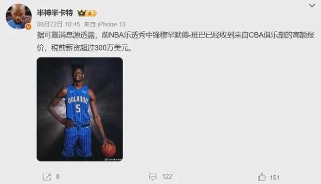 据国内媒体人报道,曾有CBA俱乐部疯狂大出血,向班巴报价薪资税前超过300万美元,可是显而易见人家不为所动。