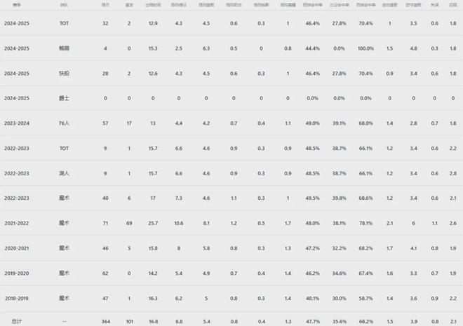 18年-25年,短短七年时间里,班巴效力过的球队有魔术、湖人、费城、快船、鹈鹕,以及现在的猛龙,迄今为止常规赛场均出战16.8分钟得到6.8分5.4板1.3帽,季后赛场均亮相3.3分钟仅有0分1板0.3助0.3帽进账。