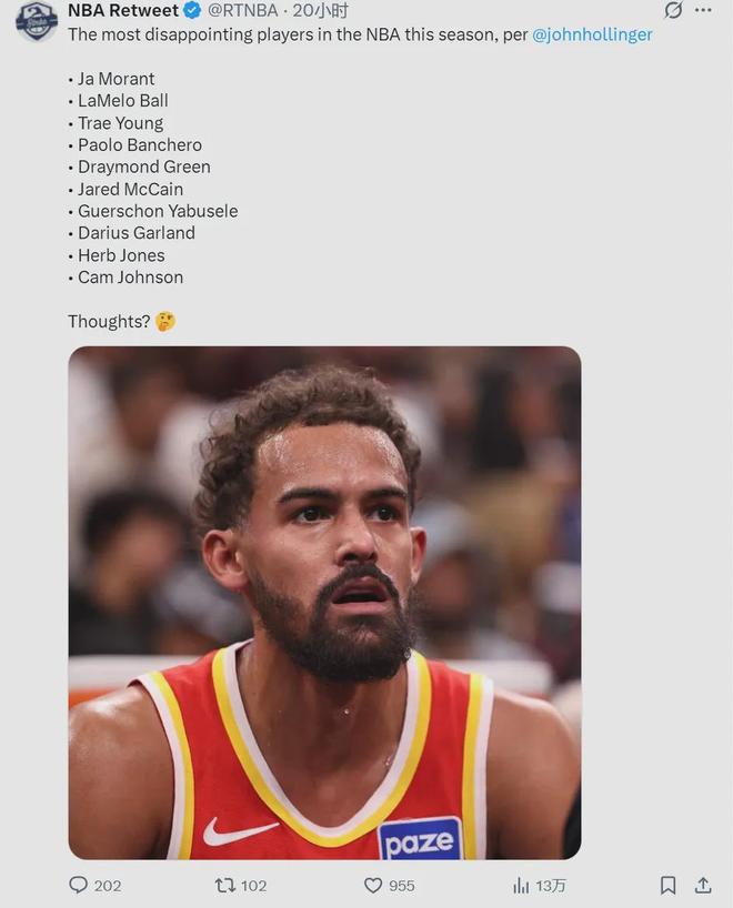 特雷杨的困境和莫兰特差不多,2025年休赛期,老鹰拒绝给他4年2.29亿美元的续约合同。本赛季特雷杨出战的比赛,老鹰只有2胜8负,胜率20%;当他缺阵时,老鹰14胜11负,胜率56%。杰伦-约翰逊成为新鹰王,特雷杨很尴尬。