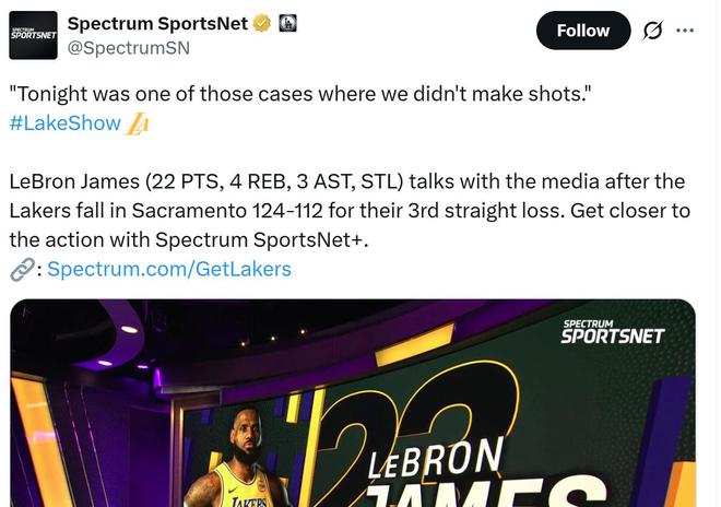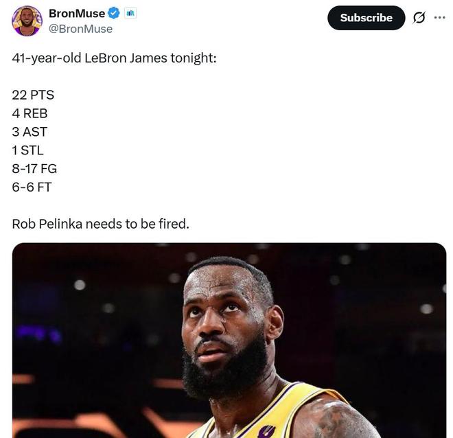 面对这样一场失利,赛后湖人媒体BronMuse晒出詹姆斯本场数据,17投8中拿下22分4板3助1抢断,并配文:“佩林卡该被炒鱿鱼了。”
