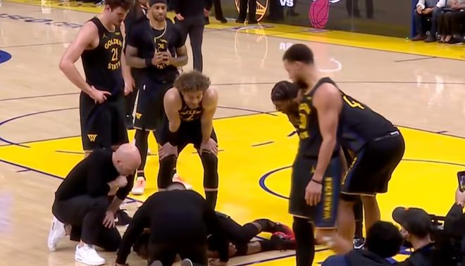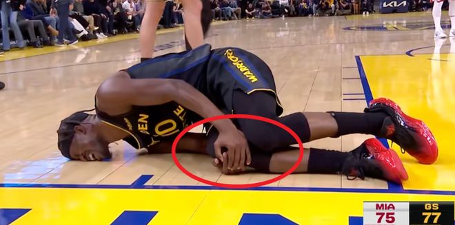 而就在今天,勇士队在对阵热火的比赛中,突发遭遇毁灭性打击,球队大核心吉米·巴特勒在第三节一次平常的接球后,膝盖突然向内扭曲,他痛苦地捂住右膝倒在地上。勇士队马上喊出暂停,队友们迅速围上前查看巴特勒的情况。随后,巴特勒在希尔德和库明加的搀扶下缓缓离场,整个过程中,他的右脚几乎不能受力。