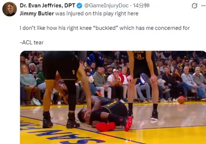 果不其然,比赛后仅仅不到3个小时,NBA知名记者Shams Charania确认了这一噩耗:勇士球星吉米·巴特勒遭遇右膝前十字韧带撕裂,将缺席本赛季剩余的所有比赛!
