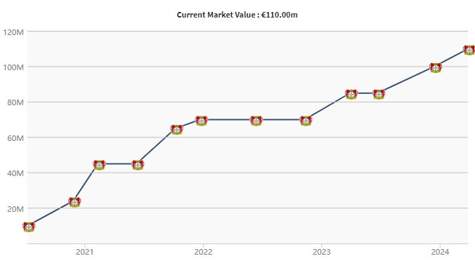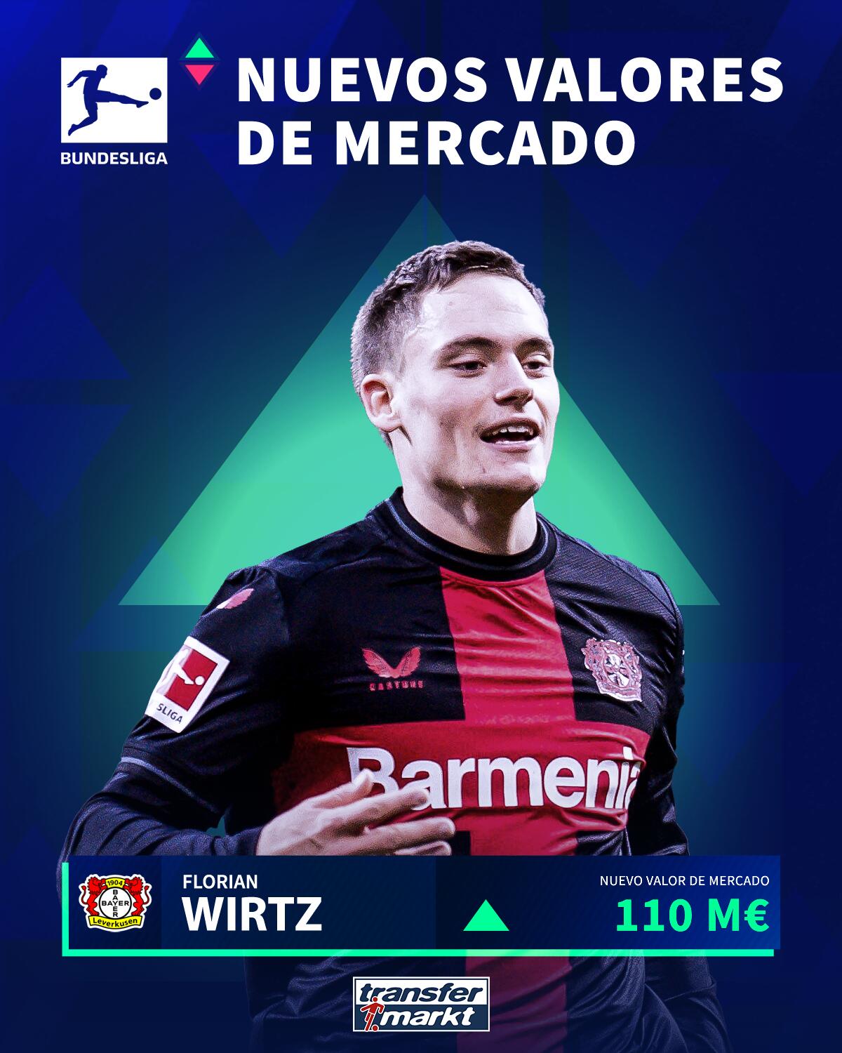 03月27日讯 今日德转更新德甲球员身价,20岁的维尔茨在去年底成为新的亿元先生后,身价再涨1000万,来到1.1亿欧。