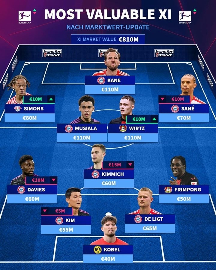 前锋:西蒙斯(莱比锡,8000万)、凯恩(拜仁,1.1亿)、萨内(拜仁,7000万)