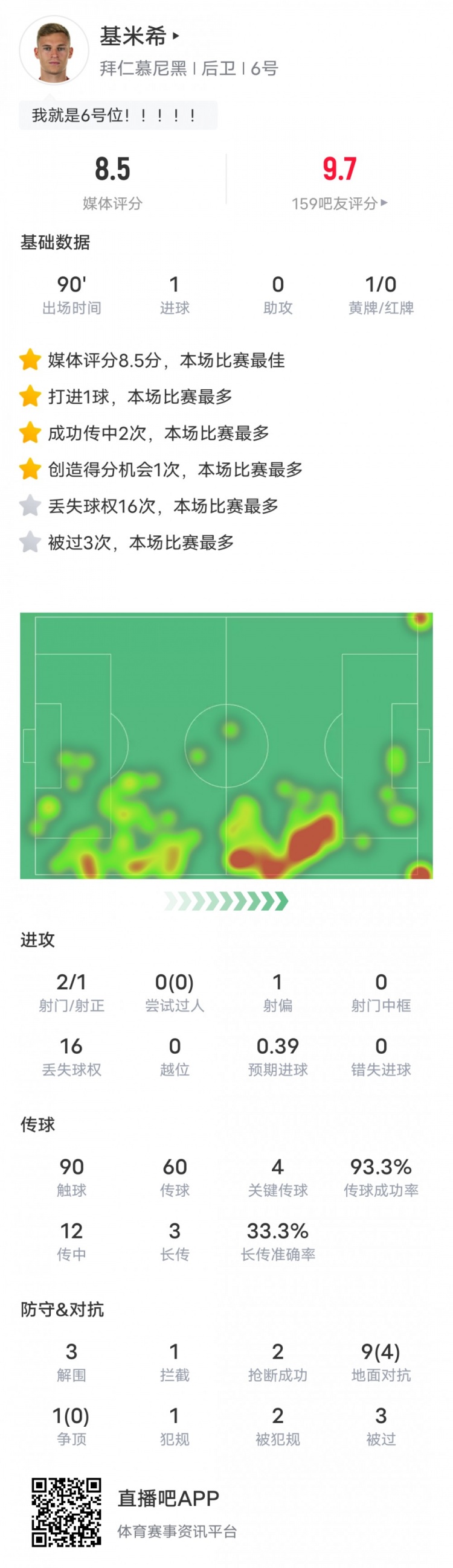 基米希本场比赛具体数据如下: