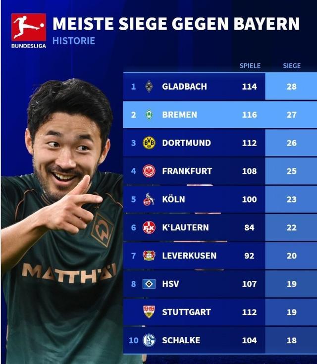 直播吧9月25日宣 德转数据统计,门兴是在德甲历史上赢下拜仁次数最多的球队,今晚对阵拜仁的不莱梅第二。