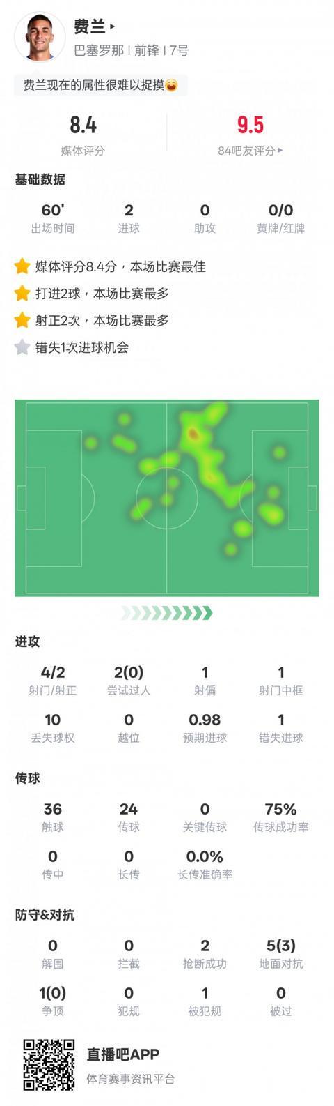 费兰-托雷斯本场比赛数据如下: