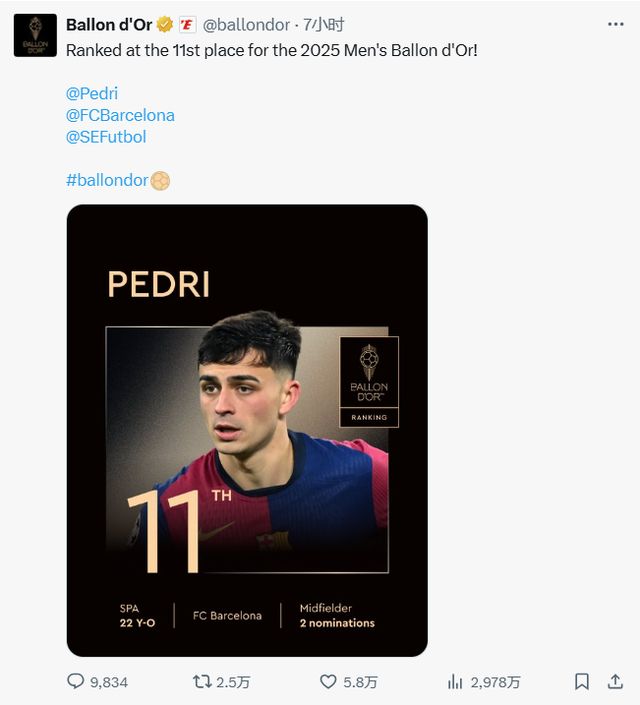 “佩德里第11”的推文,有近1万条评论,2.5万次转发,3000万次浏览。这样的热度,比金球奖得主登贝莱还高——宣布登贝莱获奖的推文,9400条评论,960万次浏览。