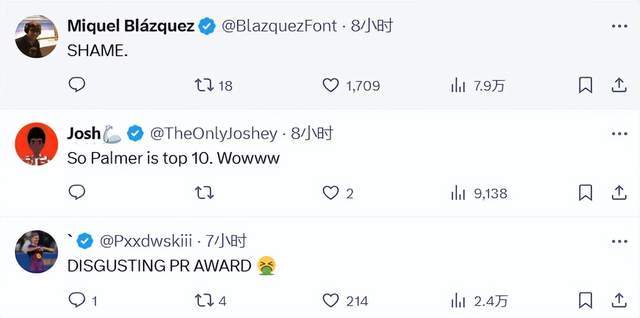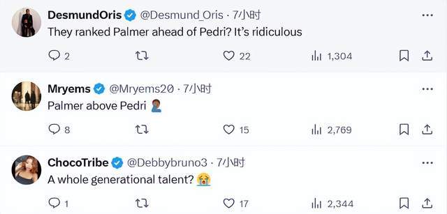 球迷的主流观点:“真是笑话,荒谬!帕尔默都排名第10,佩德里竟然还不如帕尔默?”
