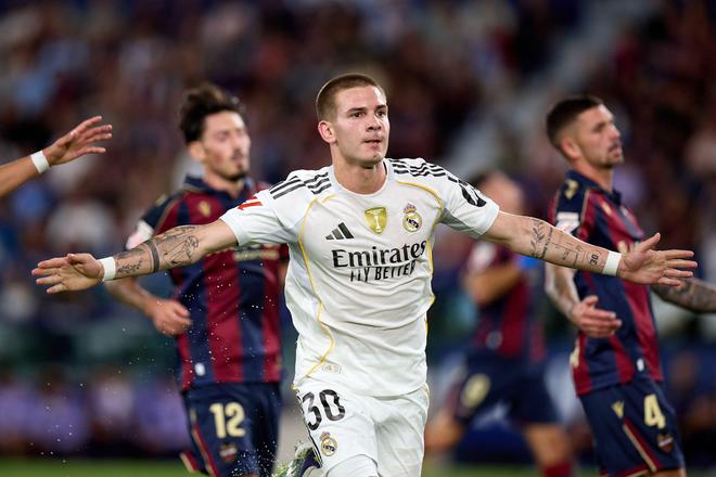 雷速体育9月24日宣 西甲联赛第6轮皇马客场对阵莱万特,上半场比赛第38分钟,18岁阿根廷小将马斯坦托诺抽射建功收获个人皇马生涯的首粒进球。