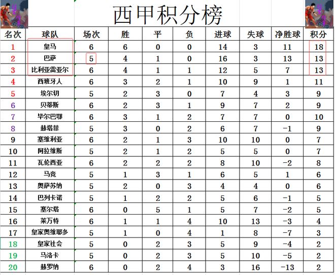 积分榜方面,皇马大胜之后依然是新赛季唯一全胜的球队,先赛的他们再将和巴萨的差距拉大到5分。比利亚雷亚尔今天赢球后夺取连胜,先赛的情况下追上巴萨,净胜球劣势排在第3。