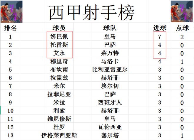 射手榜方面,姆巴佩梅开二度,6轮打入了7球,继续稳居榜首。艾永破门后,追上托雷斯和穆里奇,4球并列第2。维尼修斯传射建功,杜罗破门,追上拉菲尼亚,布坎南等人3球挤入前十。