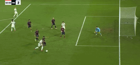 皇马随后又重新展开猛烈攻势,姆巴佩开始爆发,第62分钟,姆巴佩禁区右侧突破下底一个急停回扣,回防的伊尔格扎巴尔刹车不住将姆巴佩铲倒,主裁吹罚了点球。姆巴佩亲自操刀主罚勺子点射罚进,皇马3:1再次取得2球领先优势。仅仅再过2分钟,姆巴佩再来,这次皇马中后场快速反击,居莱尔中线处送出精妙的过顶挑传,姆巴佩反越位成功完全甩开回防球员接球突入禁区获得单刀良机,姆巴佩过掉出击的门将瑞恩,轻松推射空门得手,姆巴佩梅开二度,皇马4:1锁定胜局。