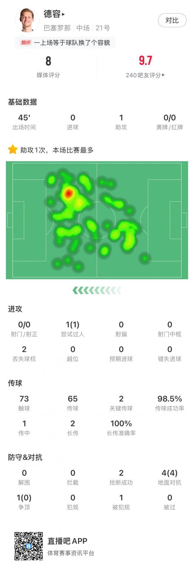 德容半场时间73次触球,65次传球,2次关键传球,4次地面对抗全部成功,2次抢断成功。