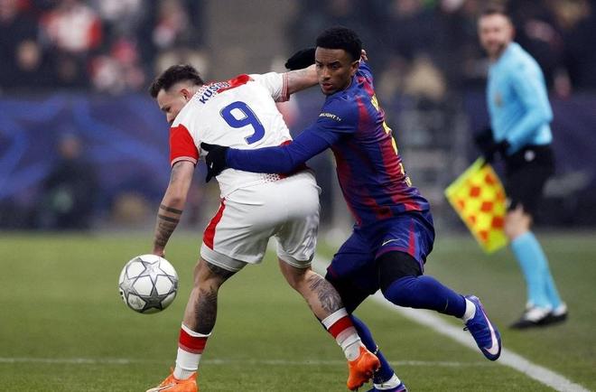 比赛刚刚开打第4分钟,巴萨后防就集体梦游,给了绍里起脚攻门的机会,好在后者没有压住一脚放了高射炮,不过7分钟之后,布拉格斯拉维亚还是率先取得领先,右侧角球开出后,前点头球一蹭,后点包抄的库谢伊将皮球撞入球门,将比分改写为了1-0,凭借此球布拉格斯拉维亚打破了自己连续5场欧冠的进球荒。