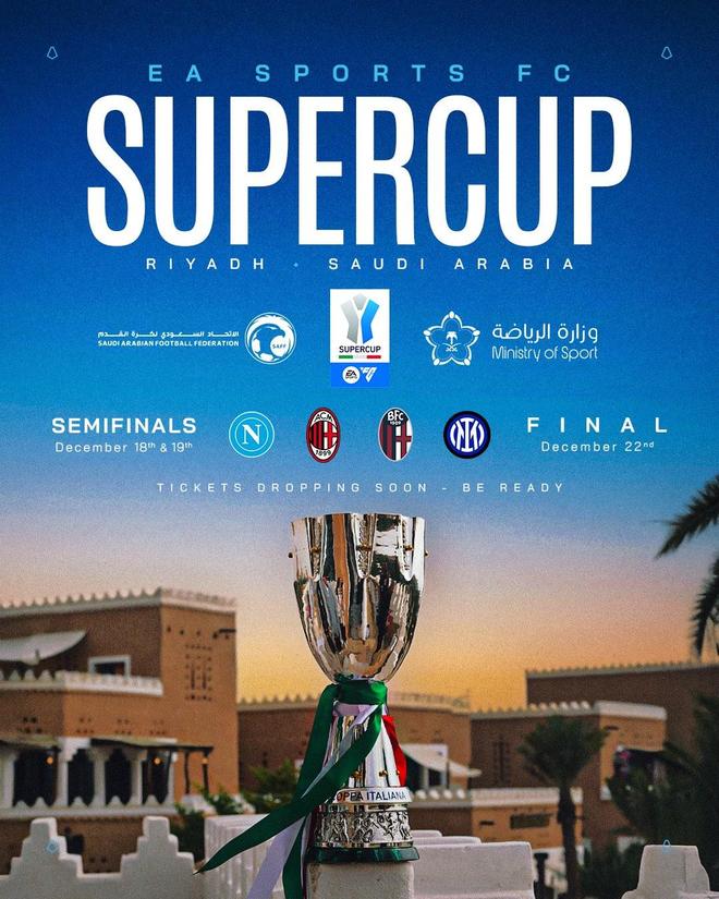意甲官方确认,第38届意大利超级杯今年12月18日至22日将会在沙特首都利雅得举行,两场半决赛那不勒斯vsAC米兰以及博洛尼亚vs国际米兰将会分别在12月18日和19日进行,两场比赛的胜者则会在12月22日决出最终的冠军。