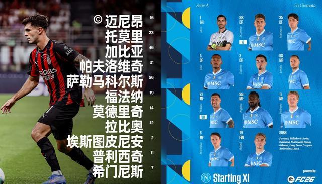 米兰本场派上普利希奇和希门尼斯搭档双前锋,莫德里奇、拉比奥和福法纳坐镇中场。那不勒斯则是霍伊伦突前,身后有德布劳内、麦克托米奈、安古伊萨和波利塔诺。